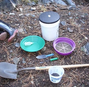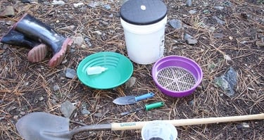 You'll need a basic gold pan, a small shovel, a classifier, and a plastic "snuffer bottle" to capture the small gold you find, and a small glass or plastic vial to hold the gold for safe keeping!